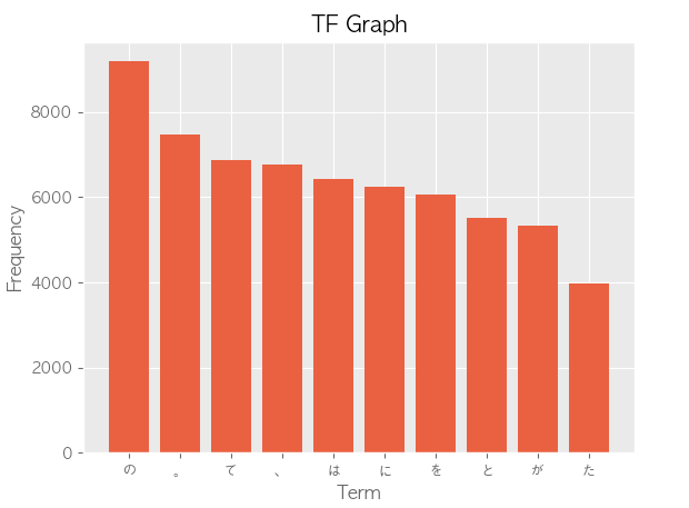 Display the 10 words with high frequency of appearance and their frequency of appearance in a graph (for example, a bar graph).