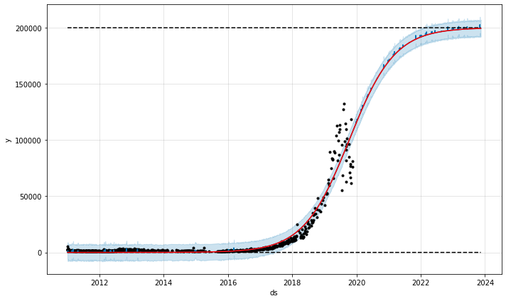 Après ma connaissance d'Instagram et quelques essais et erreurs, j'ai décidé de limiter le nombre de likes à 200000 et la limite inférieure à 0. Dans Prophet, ces valeurs peuvent être définies en fonction du temps et ne doivent pas nécessairement être des constantes. Dans ce cas, vous avez vraiment besoin d'une valeur constante: